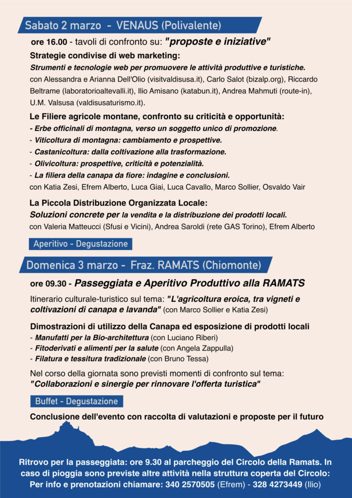 A causa del maltempo, si comunica che la passeggiata prevista nella mattinata di domenica 3 marzo alla Ramat di Chiomonte è rimandata. Tutte le altre attività previste per domenica verranno svolte al coperto presso il centro polivalente del comune di Venaus.